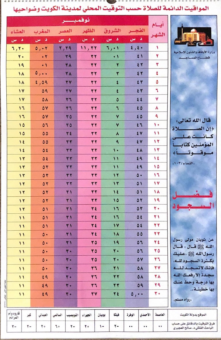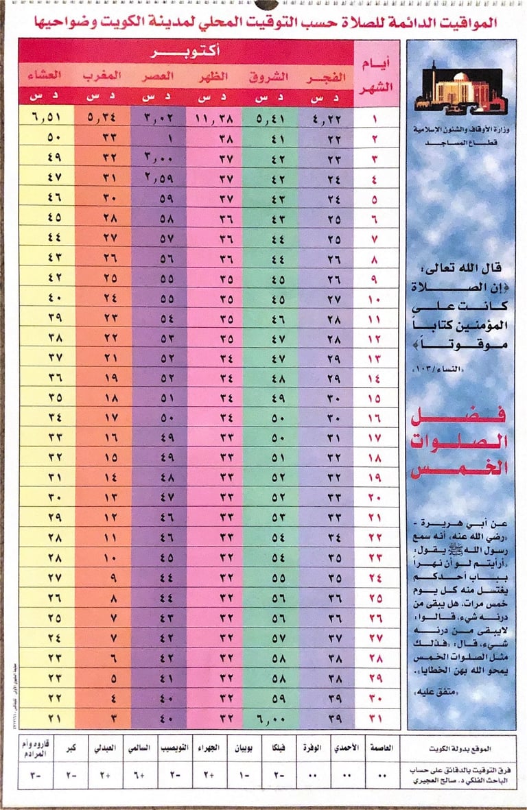أوقات الصلاة حسب التوقيت المحلي لدولة الكويت.